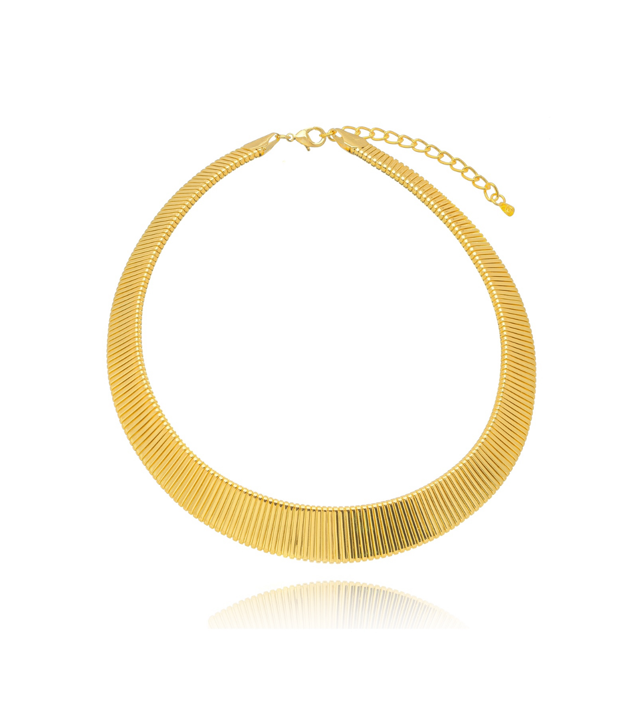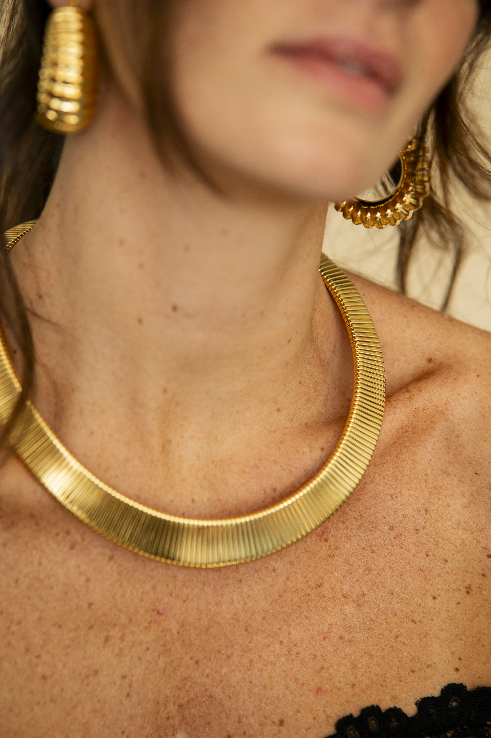 Não a toa o colar Cleópatra tem esse nome. Pensa em um acessório que não passa batido. O colar é todo banhado à ouro 18k, mais rígido e texturizado. Por ele ser tão notável, vale trazer o protagonismo para ele, vestindo um tomara que caia, uma camisa básica mais abertona ou uma gola alta para ele sobrepor. A upper que usa esse colar, tem muita clareza do seu estilo e intenções. Hipoalergênico.